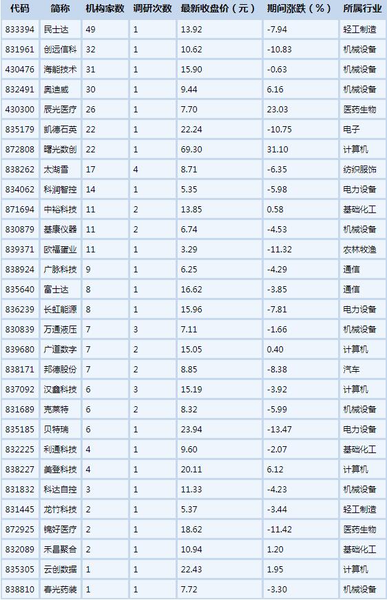 機(jī)構(gòu)調(diào)研榜單中,民士達(dá)參與調(diào)研的機(jī)構(gòu)合計(jì)達(dá)49家,最受關(guān)注;其次是創(chuàng)遠(yuǎn)信科、海能技術(shù)、奧迪威,參與調(diào)研的機(jī)構(gòu)分別有32家、31家、30家。