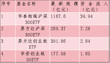 其中,華泰柏瑞滬深300ETF當(dāng)日增加9.87億份,至329.77億份,資金凈流入達(dá)34.94億元。易方達(dá)滬深300ETF當(dāng)日增加4.30億份,至171.08億份,資金凈流入達(dá)7.28億元。此外,易方達(dá)創(chuàng)業(yè)板ETF、富國(guó)上證指數(shù)ETF單日“吸金”均超2億元。