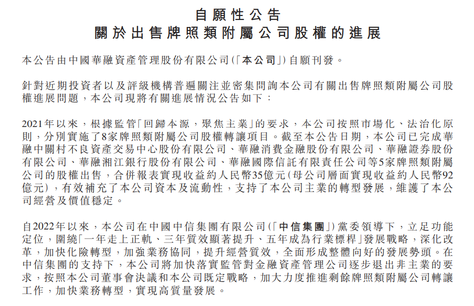 中國(guó)華融發(fā)布的另一則公告顯示,中國(guó)華融目前已完成華融中關(guān)村不良資產(chǎn)交易中心股份有限公司、華融消費(fèi)金融股份有限公司、華融證券股份有限公司、華融湘江銀行股份有限公司、華融國(guó)際信托有限責(zé)任公司等5家牌照類附屬公司的股權(quán)出售,合并報(bào)表實(shí)現(xiàn)收益約人民幣35億元(母公司層面實(shí)現(xiàn)收益約人民幣92億元)。