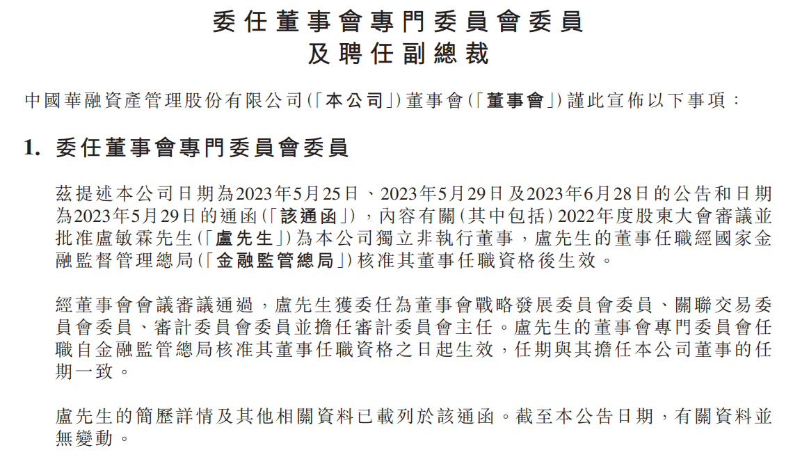 此外,中國(guó)華融還發(fā)布了高管變更公告,公告顯示,盧敏霖獲委任為董事會(huì)戰(zhàn)略發(fā)展委員會(huì)委員、關(guān)聯(lián)交易委員會(huì)委員、審計(jì)委員會(huì)委員并擔(dān)任審計(jì)委員會(huì)主任。徐炯煒獲聘任為中國(guó)華融副總裁,其任期自金融監(jiān)管總局核準(zhǔn)相關(guān)任職資格之日起,至董事會(huì)另聘或解聘時(shí)止。