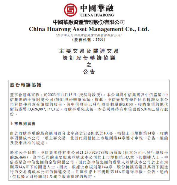 同時(shí),中國(guó)華融發(fā)布公告稱,11月15日,該公司與中信集團(tuán)及其全資子公司中信盛星簽訂股份轉(zhuǎn)讓協(xié)議,將以136.27億港元(每股收購(gòu)價(jià)為9.35港元)收購(gòu)中信股份已發(fā)行股份數(shù)量的5.01%。收購(gòu)事項(xiàng)完成后,中國(guó)華融將持有中信股份5.01%已發(fā)行股份。