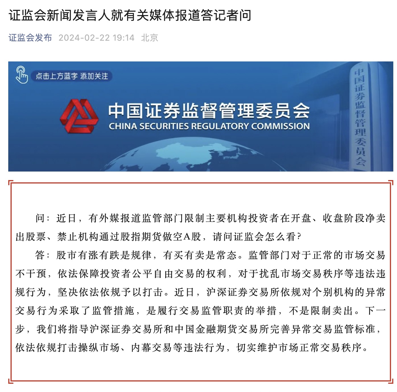 2月22日,證監(jiān)會新聞發(fā)言人答記者問時表示,股市有漲有跌是規(guī)律,有買有賣是常態(tài)。監(jiān)管部門對于正常的市場交易不干預(yù),依法保障投資者公平自由交易的權(quán)利,對于擾亂市場交易秩序等違法違規(guī)行為,堅決依法依規(guī)予以打擊。近日,滬深證券交易所依規(guī)對個別機構(gòu)的異常交易行為采取了監(jiān)管措施,是履行交易監(jiān)管職責(zé)的舉措,不是限制賣出。