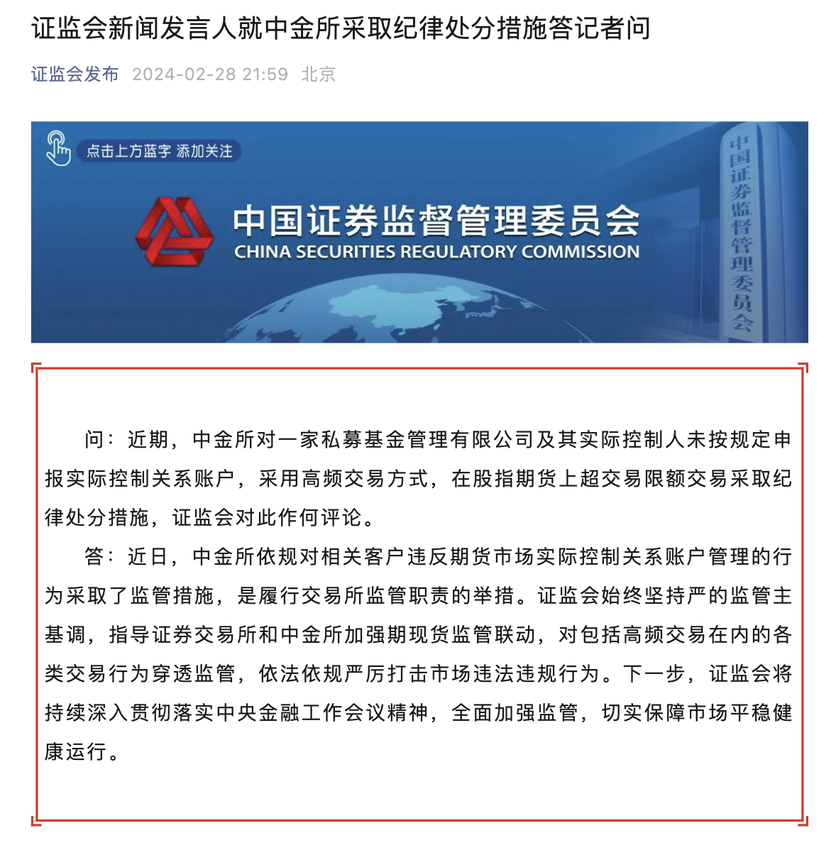據(jù)證監(jiān)會2月28日消息,近期,中金所對一家私募基金管理有限公司及其實際控制人未按規(guī)定申報實際控制關(guān)系賬戶,采用高頻交易方式,在股指期貨上超交易限額交易采取紀律處分措施。