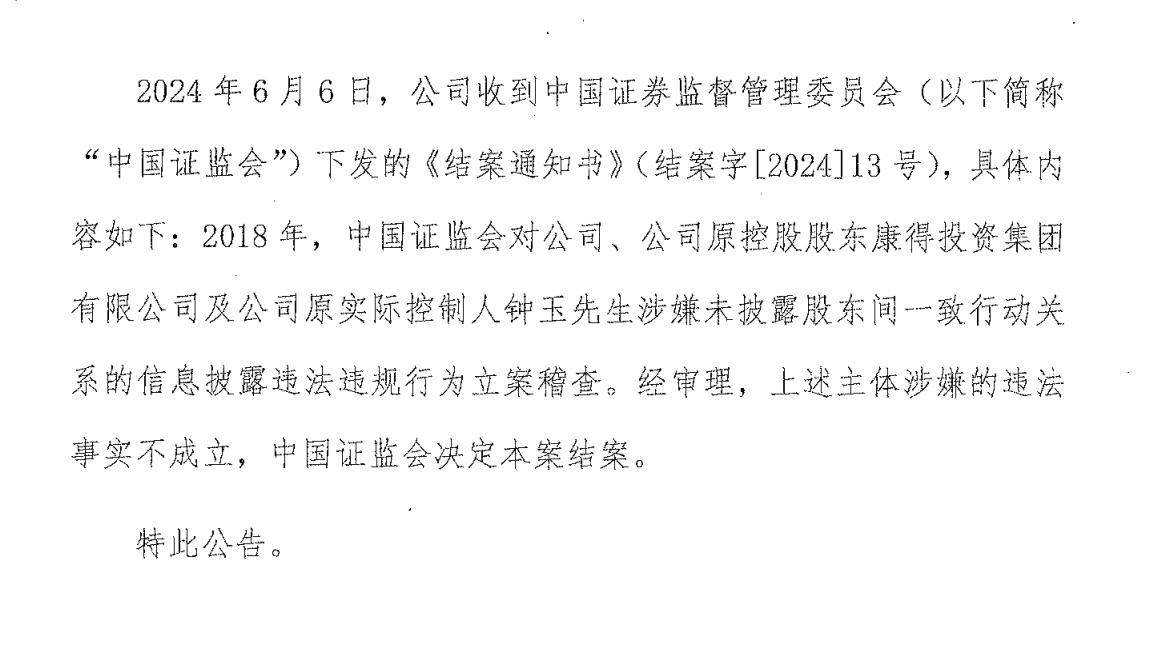 6月12日,康得新在上海清算所公告稱,公司于6月6日收到中國證券監(jiān)督管理委員會(以下簡稱“中國證監(jiān)會”)下發(fā)的《結(jié)案通知書》,具體內(nèi)容為:2018年,中國證監(jiān)會對公司、公司原控股股東康得投資集團有限公司及公司原實際控制人鐘玉先生涉嫌未披露股東間一致行動關(guān)系的信息披露違法違規(guī)行為立案稽查。經(jīng)審理,上述主體涉嫌的違法事實不成立,中國證監(jiān)會決定本案結(jié)案。