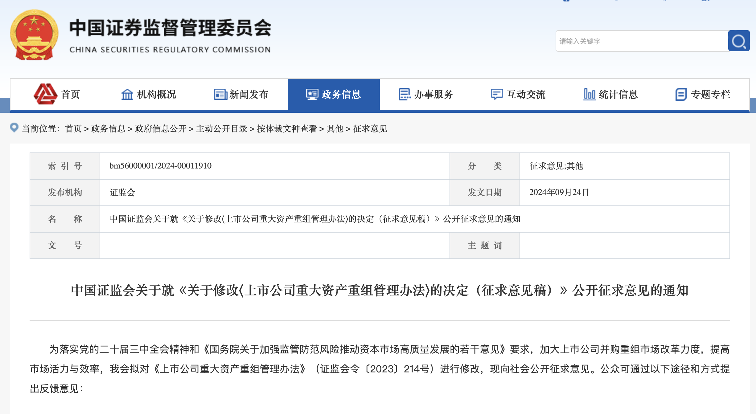 為深入貫徹黨的二十屆三中全會精神和新“國九條”要求,完善資本市場“1+N”政策體系,進一步強化并購重組資源配置功能,發(fā)揮資本市場在企業(yè)并購重組中的主渠道作用,適應(yīng)新質(zhì)生產(chǎn)力的需要和特點,支持上市公司注入優(yōu)質(zhì)資產(chǎn)、提升投資價值,證監(jiān)會在廣泛調(diào)研的基礎(chǔ)上,研究制定了《意見》。
