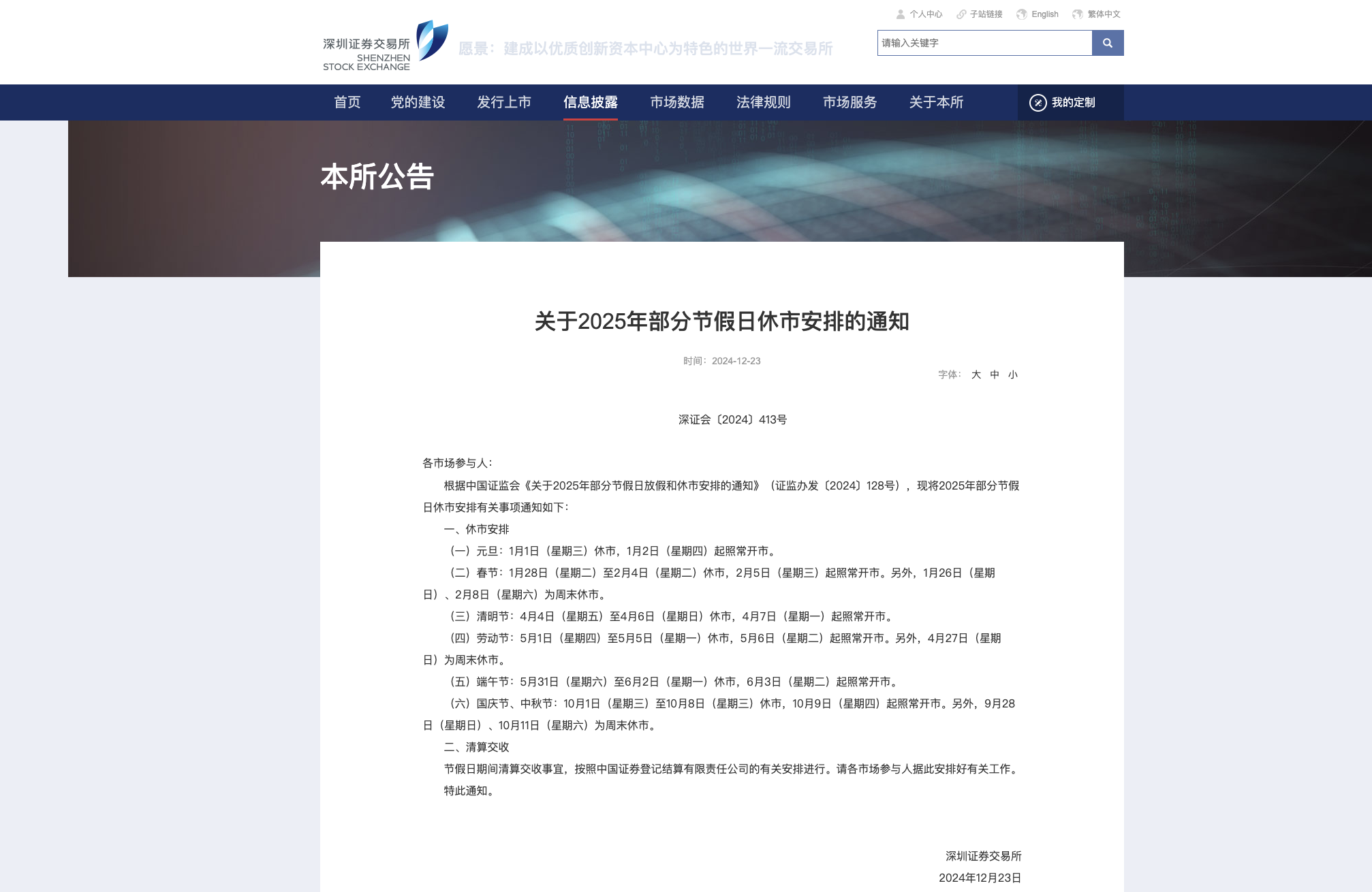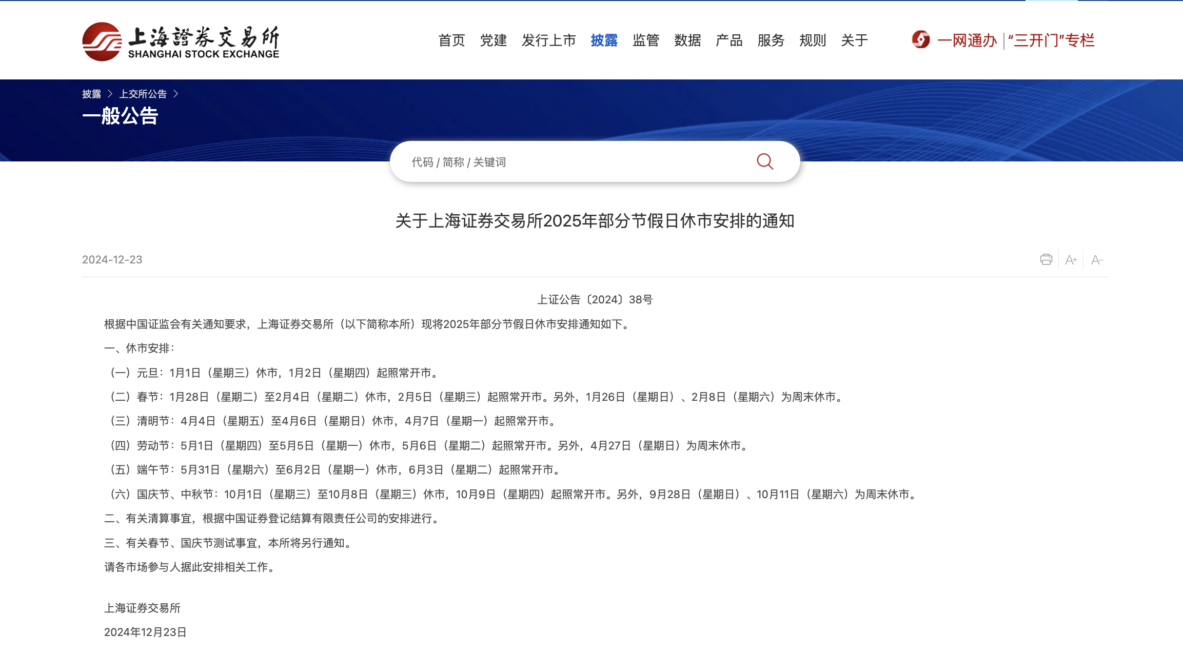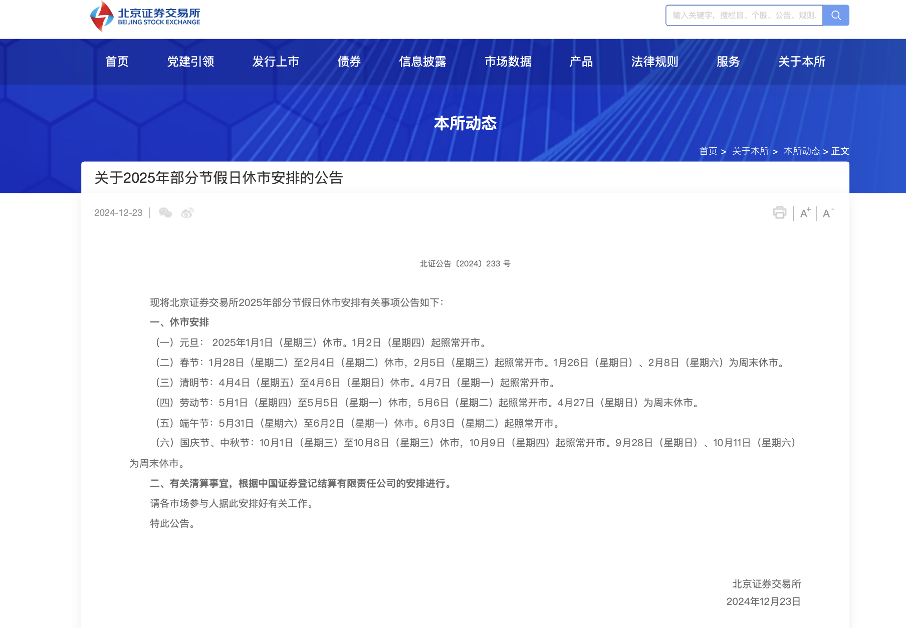 12月23日,滬深北交易所官網(wǎng)發(fā)布關于2025年部分節(jié)假日休市安排的通知。
