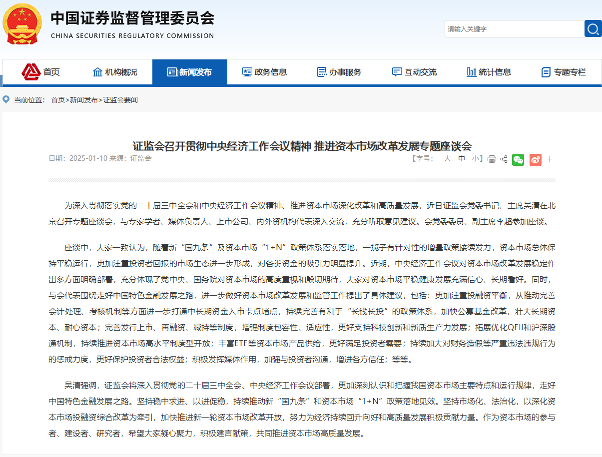 據(jù)證監(jiān)會(huì)網(wǎng)站1月10日消息,為深入貫徹落實(shí)黨的二十屆三中全會(huì)和中央經(jīng)濟(jì)工作會(huì)議精神、推進(jìn)資本市場(chǎng)深化改革和高質(zhì)量發(fā)展,近日證監(jiān)會(huì)黨委書(shū)記、主席吳清在北京召開(kāi)專(zhuān)題座談會(huì),與專(zhuān)家學(xué)者、媒體負(fù)責(zé)人、上市公司、內(nèi)外資機(jī)構(gòu)代表深入交流,充分聽(tīng)取意見(jiàn)建議。證監(jiān)會(huì)黨委委員、副主席李超參加座談。