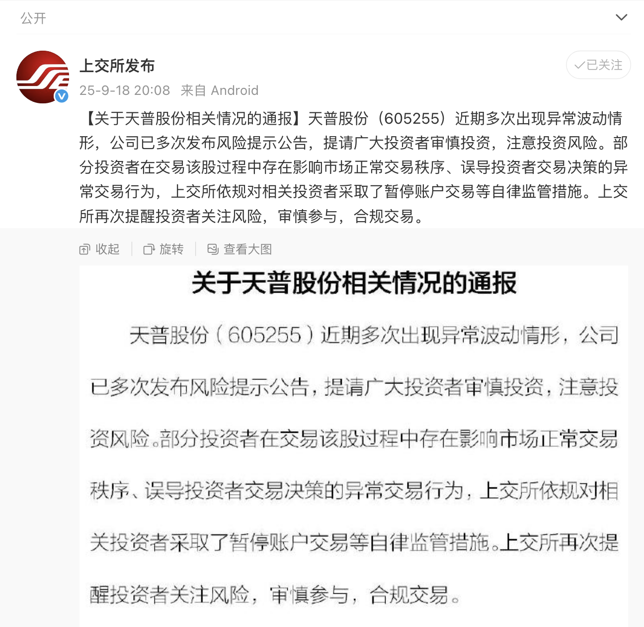 本報(bào)訊 (記者毛藝融)9月18日,上交所發(fā)布關(guān)于寧波市天普橡膠科技股份有限公司(以下簡(jiǎn)稱“天普股份”)相關(guān)情況的通報(bào)。通報(bào)顯示,天普股份近期多次出現(xiàn)異常波動(dòng)情形,公司已多次發(fā)布風(fēng)險(xiǎn)提示公告,提請(qǐng)廣大投資者審慎投資,注意投資風(fēng)險(xiǎn)。部分投資者在交易該股過程中存在影響市場(chǎng)正常交易秩序、誤導(dǎo)投資者交易決策的異常交易行為,上交所依規(guī)對(duì)相關(guān)投資者采取了暫停賬戶交易等自律監(jiān)管措施。上交所再次提醒投資者關(guān)注風(fēng)險(xiǎn),審慎參與,合規(guī)交易。