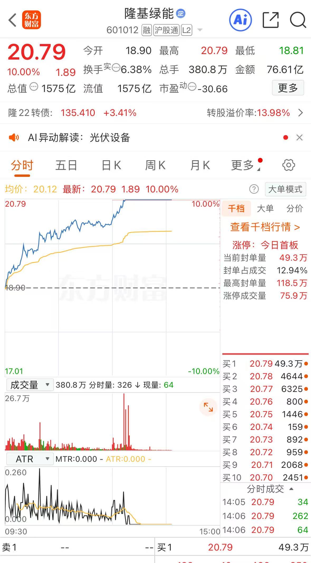 截至14點,東方財富數(shù)據(jù)顯示,從板塊來看,午后光伏設備以4%的漲幅躍居行業(yè)板塊之首,成分股中光伏龍頭企業(yè)隆基綠能“10CM”漲停,陽光能源漲超15%、通威股份漲超9%逼近漲停,大全能源、德業(yè)股份等大市值個股也隨之大漲,此外,阿特斯、弘元綠能等多只個股紛紛漲停。