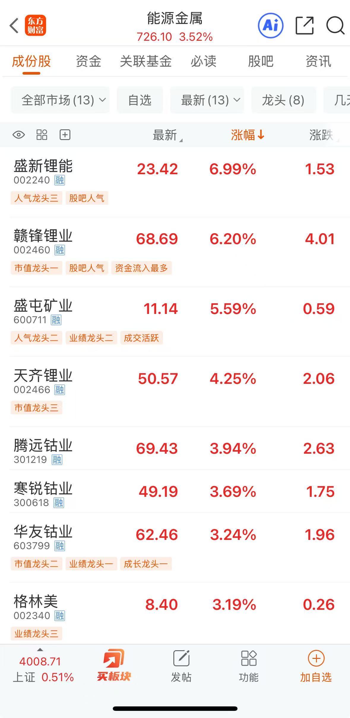 除光伏設備板塊外,鋰電板塊今日盤中表現(xiàn)也不俗。東方財富能源金屬板塊13只個股悉數(shù)飄紅,其中贛鋒鋰業(yè)、盛新鋰能漲超6%,天齊鋰業(yè)、盛屯礦業(yè)等個股跟漲。