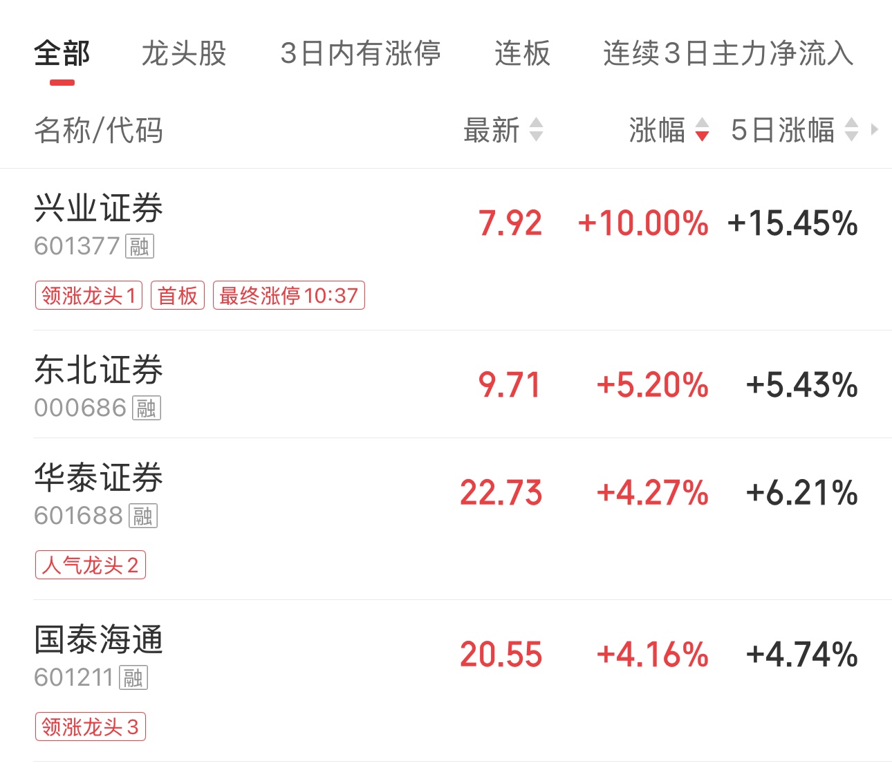 除因并購重組事項(xiàng)停牌的中金公司、信達(dá)證券、東興證券外,板塊內(nèi)其余47只個股全線飄紅,興業(yè)證券漲停,半日成交額達(dá)47.62億元;東北證券漲超5%,華泰證券、國泰海通均漲超4%;行業(yè)龍頭中信證券半日成交額超65億元。