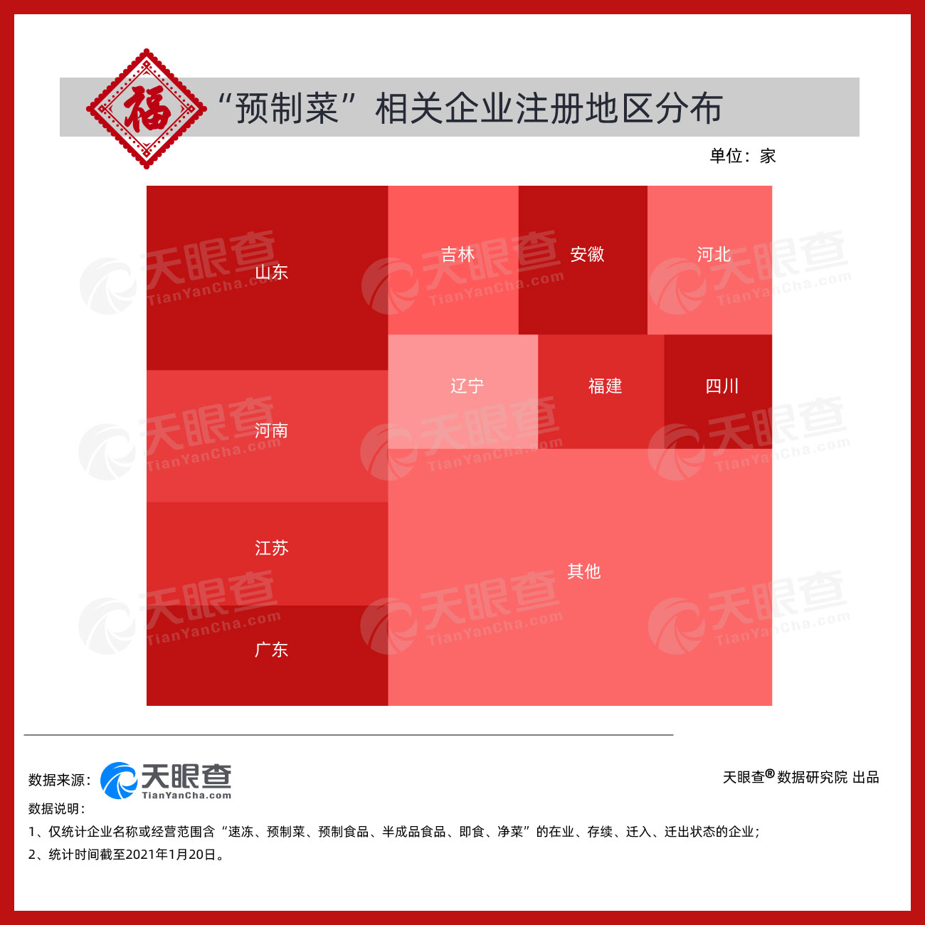 據(jù)天眼查大數(shù)據(jù)顯示,“預制菜”相關(guān)企業(yè)在近兩年快速崛起。通過界定企業(yè)名稱或經(jīng)營范圍包含“速凍、預制菜、預制食品、半成品食品、即食、凈菜”的企業(yè)發(fā)現(xiàn),截止目前,我國共有超過6.9萬家相關(guān)企業(yè)。從地域分布來看,山東省的相關(guān)企業(yè)數(shù)量最多,超9400家,占全國的13.71%。河南、江蘇、廣東均擁有超過5000家相關(guān)企業(yè),分別位列全國第二、三、四位。