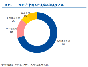 朗姿股份以女裝品牌起家,后通過投資醫(yī)美機(jī)構(gòu)切入醫(yī)美賽道,截至2020年第三季度,已擁有18家醫(yī)療美容機(jī)構(gòu)。不過,在國內(nèi)醫(yī)美市場,中端醫(yī)美機(jī)構(gòu)極為分散,除少數(shù)公立醫(yī)院以外,小型診所仍是醫(yī)美機(jī)構(gòu)的大頭,占到市場71%,大型連鎖所占市場份額總量不到6%。朗姿作為醫(yī)美機(jī)構(gòu)龍頭雛形初現(xiàn),但目前市場份額依然相當(dāng)有限。
