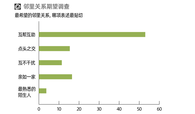 除了以上硬件設(shè)施環(huán)境,鄰里關(guān)系這樣的軟性條件也極大影響人們居住質(zhì)量。和“年輕人不愛社交”這樣的普遍認(rèn)知不同,調(diào)研發(fā)現(xiàn)53%受訪者期待互幫互助的鄰里關(guān)系,更有16.5%的人希望和鄰居親如一家。“遠(yuǎn)親不如近鄰”,在當(dāng)下依然沒有過時(shí)。