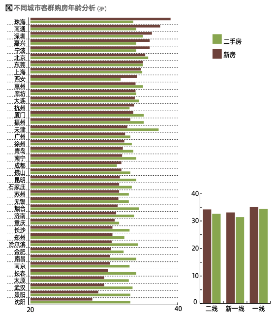貝殼研究院以40城為研究樣本,成交數(shù)據(jù)測算了購房者的實(shí)際購房年齡,新房和二手購房者平均年齡在33.3歲左右。分二手房、新房看,一線城市購買新房的平均年齡約為34.4歲,購買二手房的平均年齡約為35.1歲,兩者相差將近一歲。分具體城市看,天津人二手房購買年齡最晚,為37.2歲;成都最早,為31.6歲。在高能級城市,受制于城市高房價(jià)及限購政策等影響,消費(fèi)者購房置業(yè)難度相對較大,需要更長時(shí)間財(cái)富積累才能實(shí)現(xiàn)。