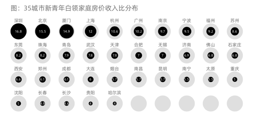 類似房價(jià)收入比,貝殼研究院還按月度租金與白領(lǐng)月薪測算出“房租收入比”。結(jié)果顯示,北京、上海及深圳的新青年群體房租收入比達(dá)到30以上,也就是說,新青年白領(lǐng)30%以上的月薪用來支付房租。