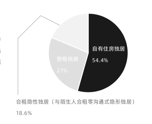報(bào)告顯示,在新青年受訪群體中,獨(dú)居的百分占比高達(dá)63.6%。從居住方式看,選擇自由住房獨(dú)居的約54.4%,其次是整租獨(dú)居,百分占比約27%,還有18.6%的受訪者因與陌生人合租零溝通,隱形獨(dú)居。