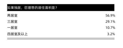 從購房選擇看,兩居室是獨(dú)居群體的理想居住戶型。39.3%的受訪者表示理想的獨(dú)居住房面積是60-90平方米,34.4%的受訪者認(rèn)為理想的獨(dú)居住房面積為90-120平方米;從戶型看,理想的獨(dú)居住房是兩居室,占比達(dá)56.9%。