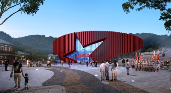 除了還原的歷史建筑,新建筑如何表達(dá)紅色主題,延安紅街也有自己的創(chuàng)意,最突出的代表有兩個(gè):一個(gè)是位于邊區(qū)廣場(chǎng)的練兵場(chǎng),這座建筑以紅旗與紅星造型為靈感,立面嚴(yán)格對(duì)稱,造型斗志昂揚(yáng),呼應(yīng)周邊陜北傳統(tǒng)建筑,展現(xiàn)出邊區(qū)廣場(chǎng)火熱的革命生活。另一個(gè)則是圣地廣場(chǎng)旁邊的再回延安體驗(yàn)館,這座建筑外墻為紅色鋁板幕墻,立面以一顆象征中國(guó)革命的五角星為主要造型,在陽(yáng)光下閃耀光芒,令人肅然起敬。