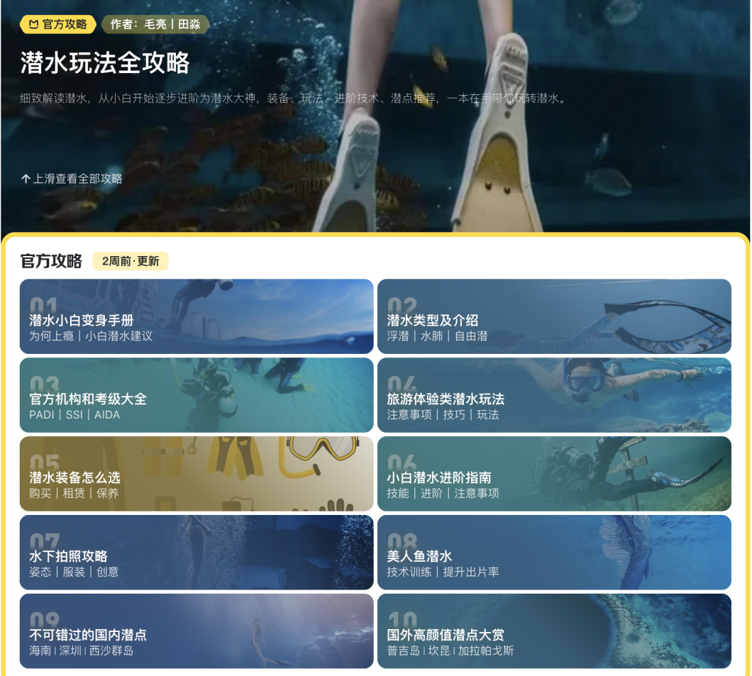 “北極星攻略”是馬蜂窩推出的一站式系統(tǒng)化旅游攻略,用全面、及時(shí)和準(zhǔn)確的信息解決游客旅行前后關(guān)心的問題,并且用精選思維進(jìn)行旅行玩樂產(chǎn)品的篩選。馬蜂窩的北極星攻略也專門為潛水、滑雪、馬拉松等運(yùn)動(dòng)項(xiàng)目建立了專屬攻略,需要哪些準(zhǔn)備工作、國(guó)內(nèi)優(yōu)質(zhì)簽點(diǎn)、考證必備知識(shí)等實(shí)用信息一應(yīng)俱全,通過一站式信息島幫助游客輕松入門‘小眾’運(yùn)動(dòng)。