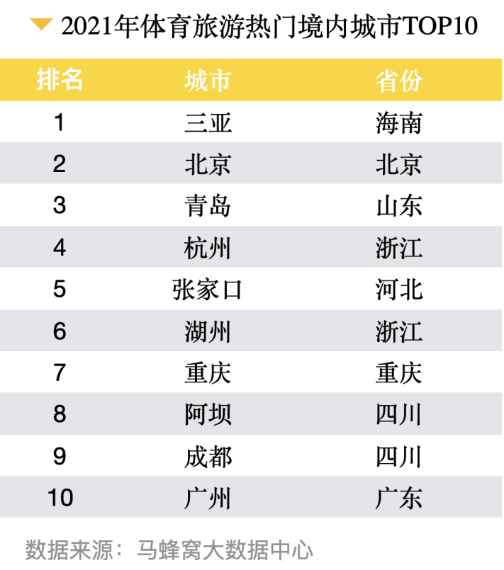 在2021年體育旅游熱門境內(nèi)城市Top10榜單上,因疫情導(dǎo)致的境外游受限,卻讓以往熱衷境外體育游人群紛紛將目光轉(zhuǎn)向境內(nèi)目的地,潛水、沖浪、浮潛、滑翔傘等曾經(jīng)的境外海島游熱門玩法,使三亞迅速躥升至境內(nèi)體育旅游熱門目的地Top1。北京憑借2022年冬奧會(huì)舉辦地的優(yōu)勢(shì)位列熱門城市第二名,青島則憑借帆船體驗(yàn)、出??慈章湮购zt、海釣等體育游樂項(xiàng)目位居第三,奧林匹克帆船中心、奧運(yùn)帆船博物館均是熱門景點(diǎn)。