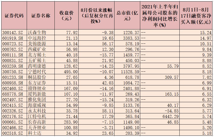 表:8月1日-8月17日融資客凈買入額超5億元股一覽