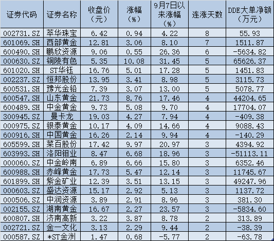 9月13日,除次新股菜百股份延續(xù)漲停外,白銀有色、銅陵有色、ST華鈺等個(gè)股也均以漲停價(jià)報(bào)收,此外,山東黃金、洛陽(yáng)鉬業(yè)、中金嶺南、赤峰黃金、中金黃金等個(gè)股漲幅也均在5%以上。另?yè)?jù)統(tǒng)計(jì),萃華珠寶、西部黃金、鵬欣資源、銅陵有色、ST華鈺、恒邦股份、豫光金鉛等7只個(gè)股連漲5天及以上。