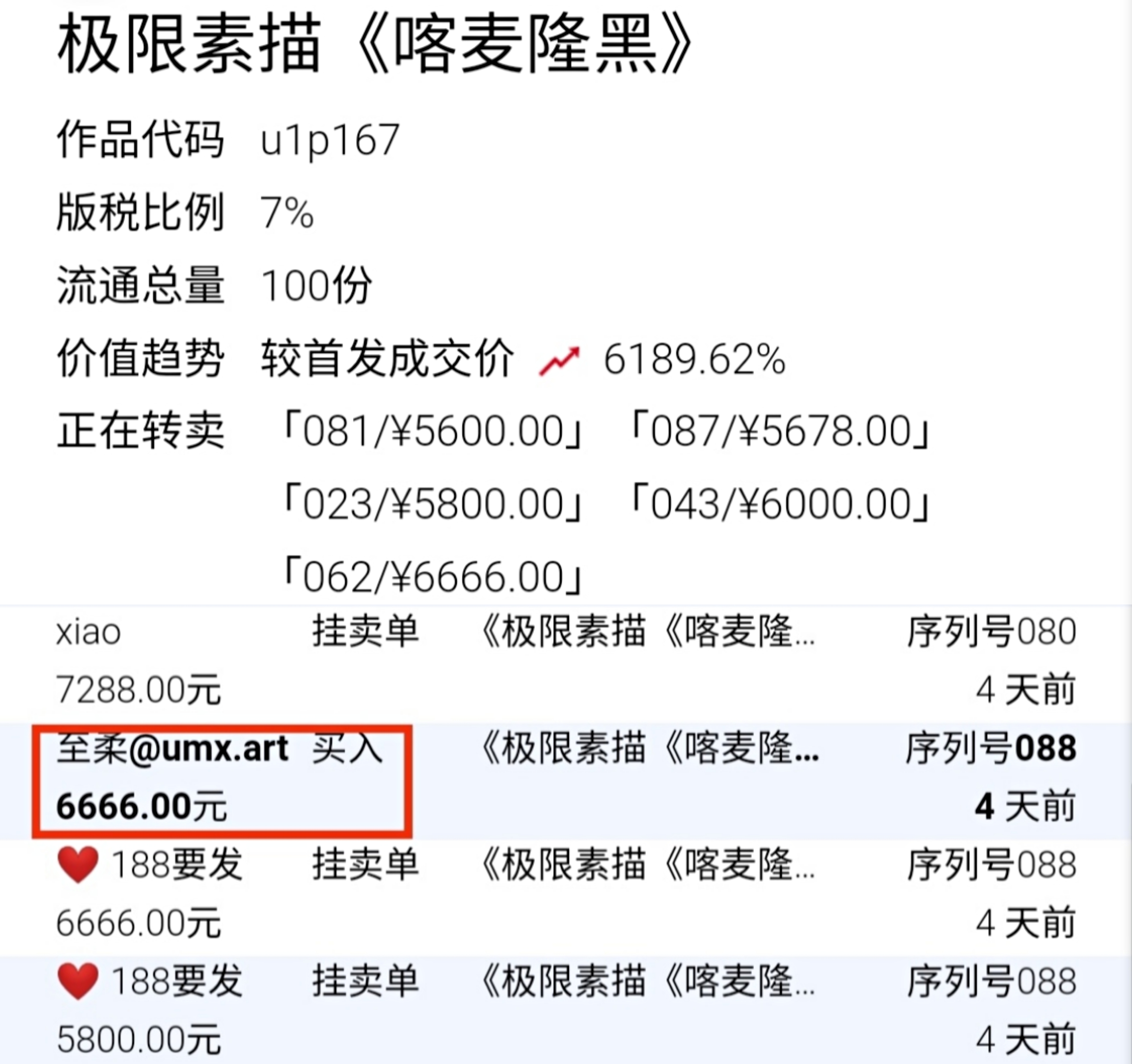 在UMX平臺二手市場,記者注意到首發(fā)價格36元發(fā)行100份的“極限素描《喀麥隆黑》”NFT商品,目前二手掛售價格已經在5000元以上,較首發(fā)成交價漲超6000%,最近一筆成交價格更是高達6666元。