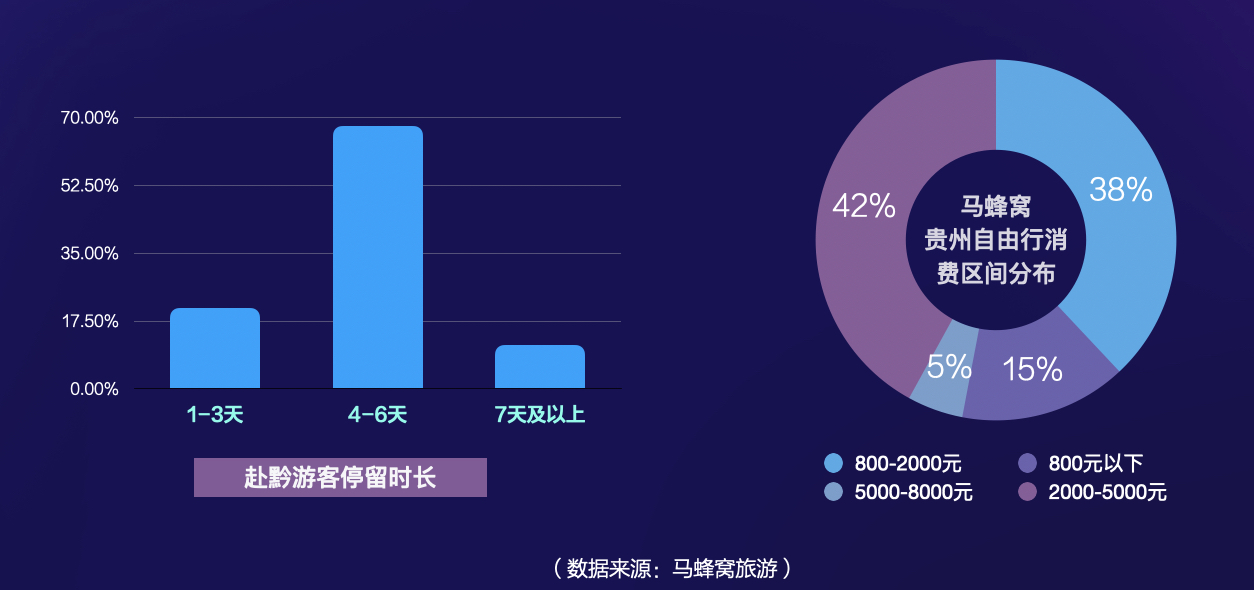 報(bào)告顯示,赴黔自由行游客目前以25-35歲為主,占比達(dá)到74.2%,年輕人已成貴州旅游消費(fèi)市場的主力。超過67%的年輕游客傾向于在貴州停留4-6天,在自由行的消費(fèi)分布中,2000元-5000元占比達(dá)到42%。