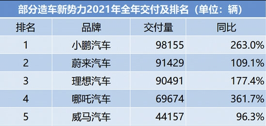 蔚來汽車方面,2021年共交付91429輛汽車,同比增長109.1%。截至2021年12月31日,ES8、ES6和EC6的累計(jì)交付量已達(dá)到167070輛;理想汽車方面,2021年的總交付90491輛汽車,同比增長177.4%。在2021年12月交付了14087輛汽車,同比增長130%。
