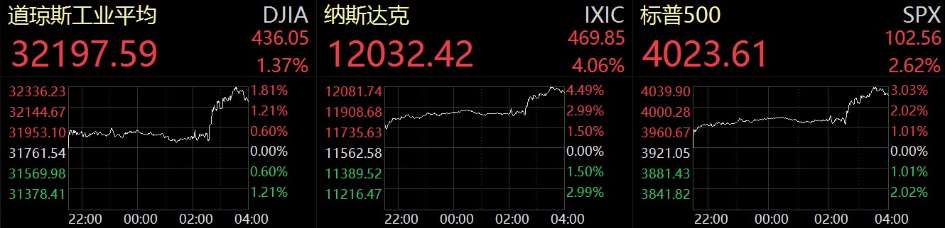市場分析人士普遍認為本次加息符合市場預(yù)期。受到消息面影響,當(dāng)?shù)貢r間7月27日,美股三大指數(shù)集體收漲,其中,道瓊斯指數(shù)漲1.37%,報32197.59點;標(biāo)普500指數(shù)漲2.62%,報4023.61點;納斯達克指數(shù)漲4.06%,報12032.42點,創(chuàng)2020年4月份以來最大單日漲幅。