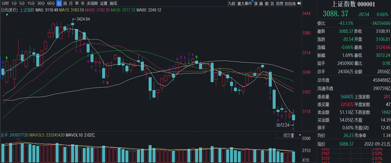 本周(9月19日-9月23日,下同),A股三大股指全線回落。上證指數(shù)周跌1.22%,報(bào)3088.37點(diǎn);深證成指周跌2.27%,報(bào)11006.41點(diǎn);創(chuàng)業(yè)板指周跌2.68%,報(bào)2303.91點(diǎn)。