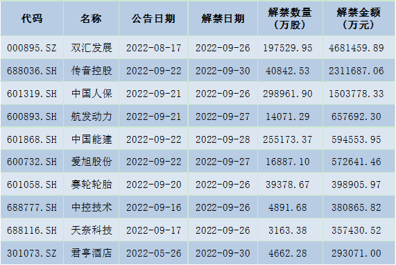 表:下周解禁金額前十位(本周收盤價(jià)計(jì)算)