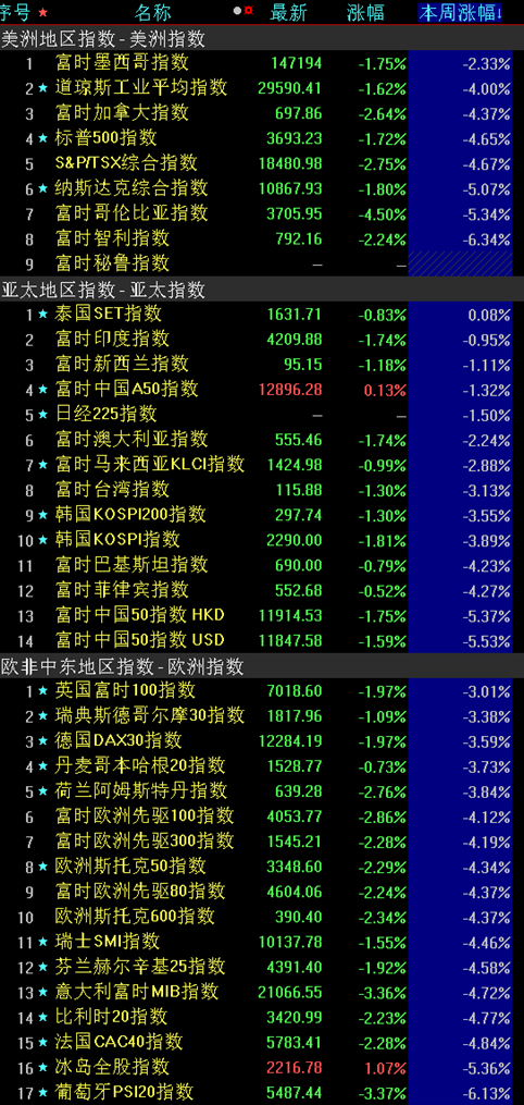 本周海外股市普遍回落。美股三大指數(shù)齊跌,道指周跌幅達(dá)4.00%;標(biāo)普500指數(shù)跌幅達(dá)4.65%;納指周跌幅達(dá)5.07%。歐洲方面,三大股指周線回落,英國富時(shí)100指數(shù)周跌3.01%,德國DAX30指數(shù)周跌3.59%,法國CAC40指數(shù)周跌4.84%。亞太股市,日經(jīng)225指數(shù)周跌1.50%;韓國KOSPI指數(shù)周跌3.89%。