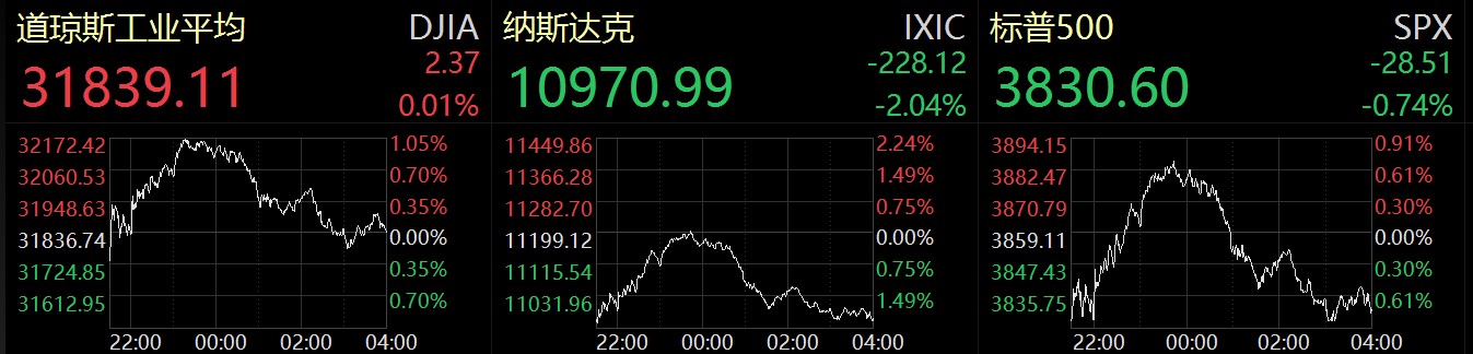 當?shù)貢r間10月26日,美股三大指數(shù)收盤漲跌不一,其中,道瓊斯指數(shù)漲0.01%,報31839.11點;標普500指數(shù)跌0.74%,報3830.60點;納斯達克指數(shù)跌2.04%,報10970.99點。其中,納斯達克指數(shù)和標普500指數(shù)終結連續(xù)3個交易日的上漲行情。