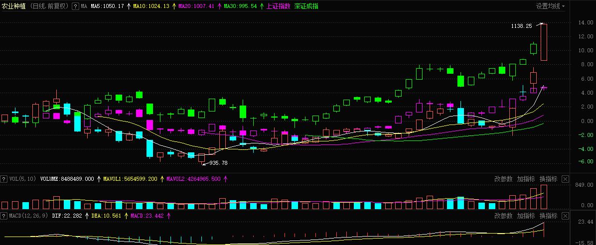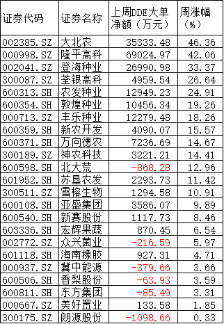 大量資金推動(dòng)了農(nóng)業(yè)種植板塊的上漲,數(shù)據(jù)顯示,本周板塊內(nèi)23只個(gè)股合計(jì)大單凈額流入高達(dá)19.41億元,其中17只個(gè)股凈流入,流入額最高的是隆平高科,達(dá)到6.90億元,大北農(nóng)、登海種業(yè)、農(nóng)發(fā)種業(yè)、豐樂種業(yè)、敦煌種業(yè)緊隨其后,周大單凈額均超過1億元。如此大的資金必然激起板塊內(nèi)個(gè)股的大漲,其中,大北農(nóng)本周的4個(gè)交易日內(nèi)連續(xù)漲停,周漲幅高達(dá)46.36%,隆平高科、登海種業(yè)、荃銀高科、農(nóng)發(fā)種業(yè)、敦煌種業(yè)、豐樂種業(yè)、新農(nóng)開發(fā)、萬向德農(nóng)、神農(nóng)科技、北大荒、蘇墾農(nóng)發(fā)、雪榕生物等12只個(gè)股周漲幅也均超過10%。