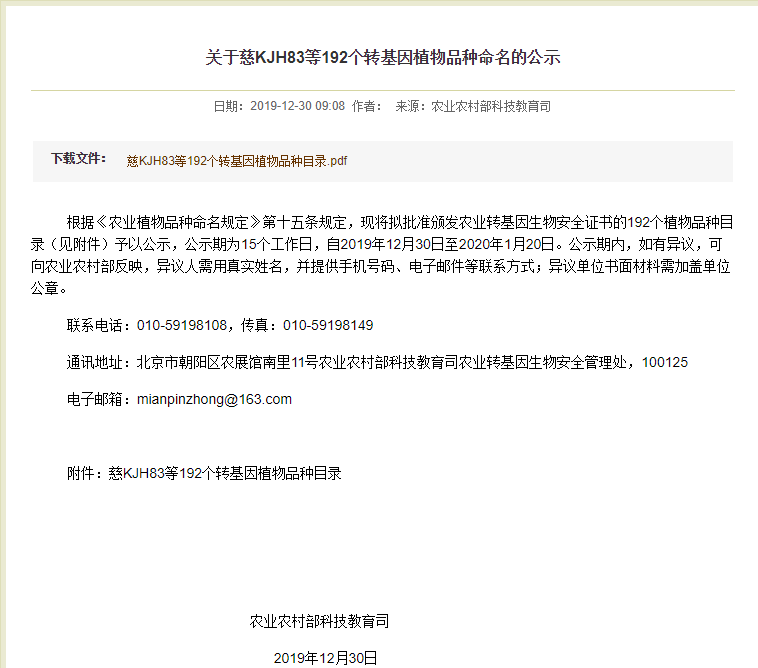此外,在2019年12月30日,農(nóng)業(yè)農(nóng)村部科技教育司發(fā)布《關(guān)于慈KJH83等192個(gè)轉(zhuǎn)基因植物品種命名的公示》,擬批準(zhǔn)為192個(gè)植物品種目錄頒發(fā)農(nóng)業(yè)轉(zhuǎn)基因生物安全證書,公示期為15個(gè)工作日,自2019年12月30日至2020年1月20日。