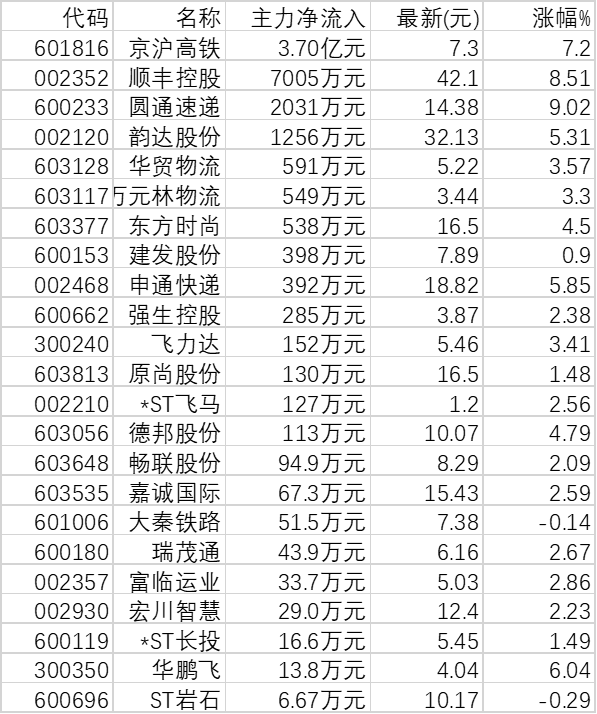 具體來看,交運(yùn)物流板塊大單資金凈流入個(gè)股有23只,占板塊有交易個(gè)股比例為39.66%,合計(jì)大單資金凈流入5.1億元。大單資金凈流入前10位的個(gè)股分別為:京滬高鐵(3.70億元)、順豐控股(7005萬元)、圓通速遞(2031萬元)、韻達(dá)股份(1256萬元)、華貿(mào)物流(591萬元)、萬元林物流(549萬元)、東方時(shí)尚(538萬元)、建發(fā)股份(398萬元)、申通快遞(392萬元)、強(qiáng)生控股(285萬元)。