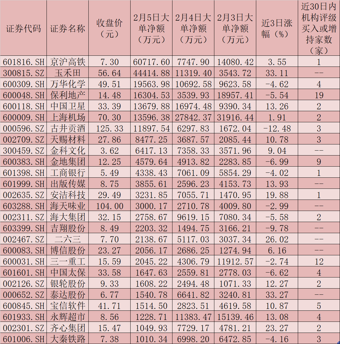 進(jìn)一步統(tǒng)計(jì)發(fā)現(xiàn),有25只個(gè)股近3日累計(jì)大單資金凈流入超過(guò)1億元,京滬高鐵、上海機(jī)場(chǎng)、玉禾田、中國(guó)衛(wèi)星、萬(wàn)華化學(xué)、保利地產(chǎn)、永輝超市等7只個(gè)股近3日均受到2億元以上大單資金搶籌,包括古井貢酒、海大集團(tuán)、三一重工、金科文化、工商銀行、大秦鐵路、天賜材料等在內(nèi)的18只個(gè)股期間累計(jì)大單資金凈流入也均超過(guò)1億元。