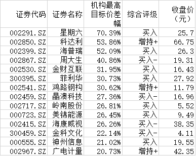 評級機構(gòu)對上述101家公司中的75家給予了推薦評級,占比74.26%。數(shù)據(jù)進一步顯示,有33家公司股票最新收盤價,較機構(gòu)推薦目標(biāo)價還有差距,其中,有包括星期六(70.39%)、科達(dá)利(53.86%)、海普瑞(52.09%)等在內(nèi)的14只個股距機構(gòu)最高目標(biāo)價還有超過20%的價差,值得投資者密切關(guān)注。