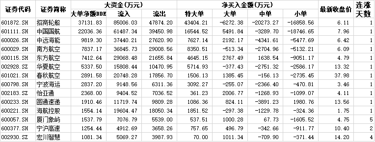 具體個股看,交通運輸行業(yè)中,有34只個股凈流入,85只個股凈流出,凈流入超1000萬元的個股為包括招商輪船(37131.83萬元)、中國國航(22036.36萬元)、中遠海能(9819.30萬元)在內(nèi)的14只個股,合計大單資金凈流入10.5億元。