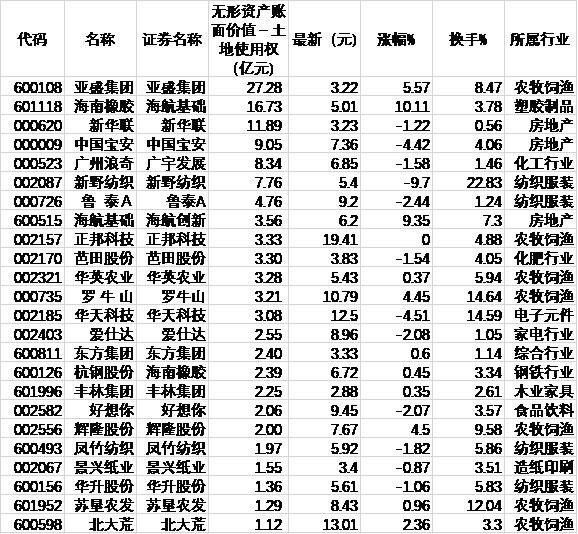 綜合來看,農(nóng)地儲備多的企業(yè)受到了更多的關注?!蹲C券日報》研究部通過同花順對市場中土地流轉板塊公司進行統(tǒng)計,顯示板塊51只成份股中,有26只無形資產(chǎn)賬面價值(土地使用權)超過1億元,其中,亞盛集團(27.28億元)、海航基礎(16.73億元)、新華聯(lián)(11.89億元)等3只個股過10億元。