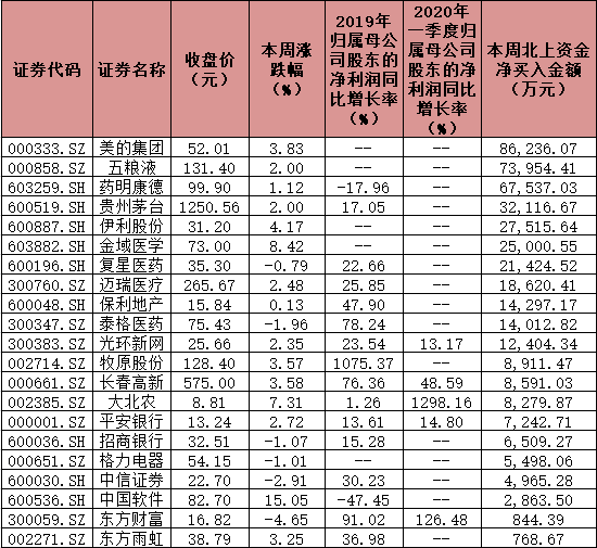 進一步梳理發(fā)現(xiàn),截至4月26日,北上資金本周凈買入的21只活躍股中,有16家公司已披露2019年年報,其中,14家公司2019年凈利潤實現(xiàn)同比增長,牧原股份2019年凈利潤同比增幅最高,達到1075.37%。此外,5家公司披露2020年一季報業(yè)績均實現(xiàn)凈利潤同比增長,大北農一季度凈利潤同比增長高達1298.16%,緊隨其后的東方財富一季度凈利潤也實現(xiàn)同比翻番,達到126.48%。