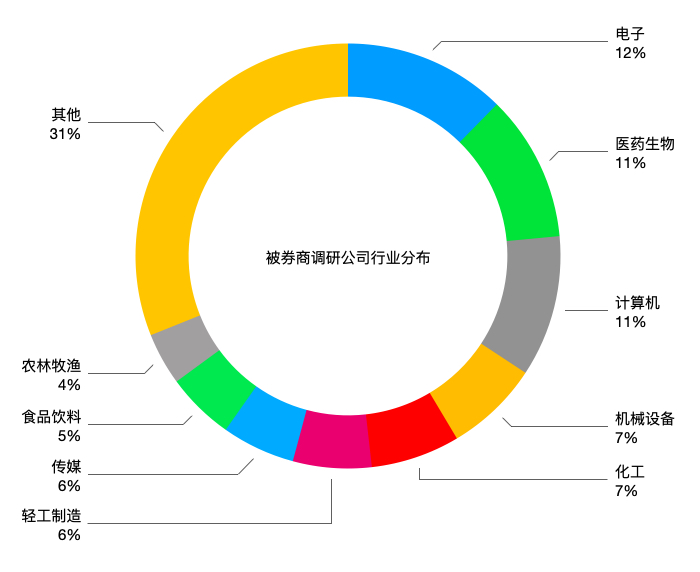 從行業(yè)分布來看,被券商調(diào)研的上市公司主要集中在電子、醫(yī)藥生物、計算機等熱門行業(yè),76.49%的公司來自“中小創(chuàng)”。
