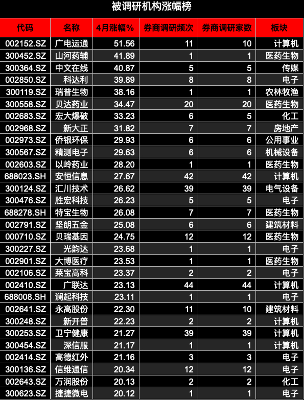 在被券商調(diào)研的251家上市公司中,今年4月份,股價漲幅超過20%的有30家,股價漲幅超過30%的有8家,股價漲幅超過50%的有1家上市公司。其中,廣電運通漲幅最高為51.56%。同時,漲幅超過40%的還有山河藥輔、中文在線,漲幅分別為41.89%、40.87%。