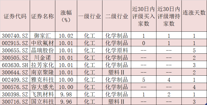 《證券日?qǐng)?bào)》記者根據(jù)同花順數(shù)據(jù)統(tǒng)計(jì)發(fā)現(xiàn),截至5月19日收盤(pán),化工板塊漲幅達(dá)1.61%,位居28類申萬(wàn)一級(jí)行業(yè)漲幅榜前列。板塊內(nèi),御家匯、中欣氟材、晶瑞股份、川金諾、拉芳家化、南京聚隆、雅克科技、容大感光、飛凱材料、國(guó)立科技等10只化工股均收獲漲停。