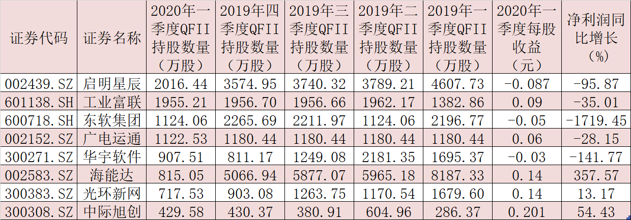 值得一提的是,以QFII為代表的外資已提前布局科技概念股。統(tǒng)計顯示,截至2020年一季度末,有35只科技概念股獲得QFII持倉,其中,啟明星辰、工業(yè)富聯(lián)、東軟集團、廣電運通、華宇軟件、海能達、光環(huán)新網(wǎng)、中際旭創(chuàng)等8只科技概念股QFII連續(xù)五個季度持倉。