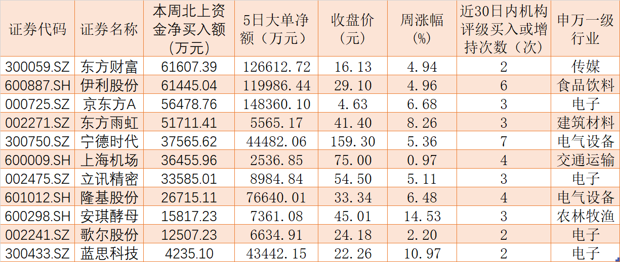值得一提的是,上述487只個(gè)股中,東方財(cái)富、伊利股份、京東方A、東方雨虹、寧德時(shí)代、上海機(jī)場(chǎng)、立訊精密、隆基股份、安琪酵母、歌爾股份、藍(lán)思科技等等11只個(gè)股本周備受北上資金的青睞,合計(jì)北上資金凈買入額39.81億元。