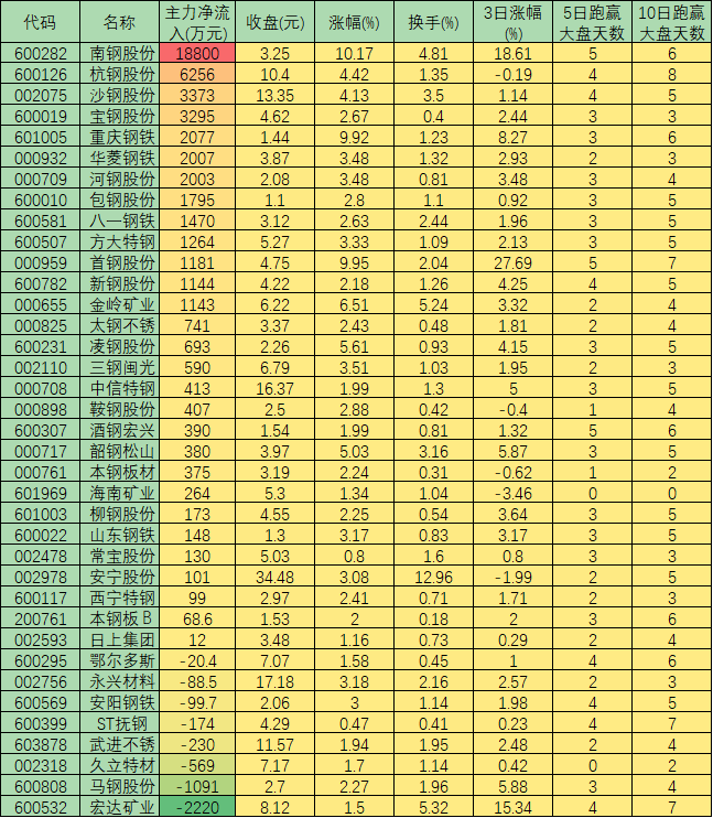 表:周二鋼鐵行業(yè)個股市場表現(xiàn)一覽