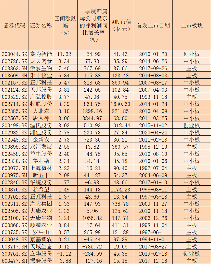 具體來(lái)看,賽為智能、龍大肉食、傲農(nóng)生物、禾豐牧業(yè)、正邦科技等5只概念股期間累計(jì)漲幅逾5%,天邦股份、廣弘控股、牧原股份、大北農(nóng)、唐人神、溫氏股份、湘佳股份、金新農(nóng)、雙匯發(fā)展、益生股份、得利斯、上海梅林、新五豐等個(gè)股期間累計(jì)上漲2%以上。